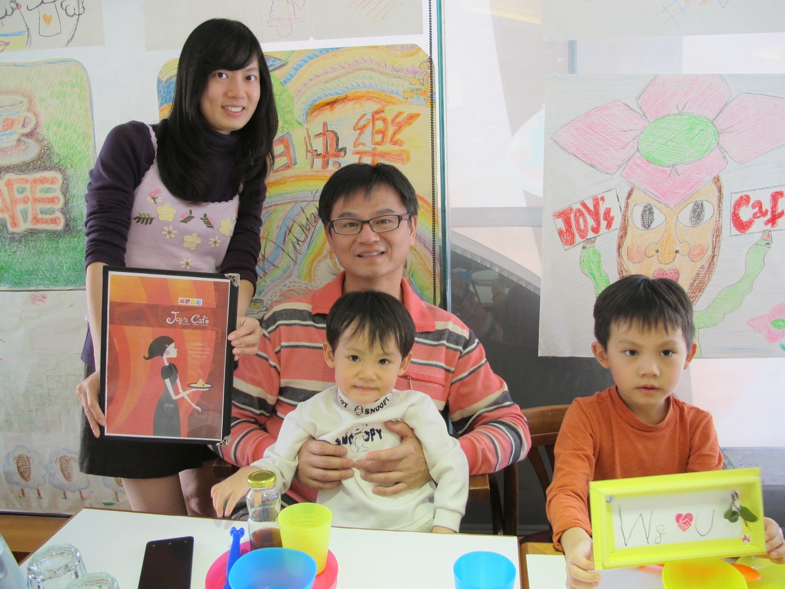 and tape from a bakery to make a card for him. 小小肚 loves noodles. We lunched at Joy's Cafe, an Italian restaurant. It uses blank paper table covers and offers crayons, so customers can enjoy painting there.